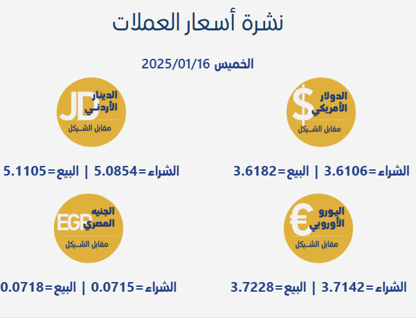 رام الله 16-1-2025 وفا- جاءت أسعار صرف العملات مقابل الشيقل الإسرائيلي، اليوم الخميس، بحسب سلطة النقد الفلسطينية، على النحو التالي: