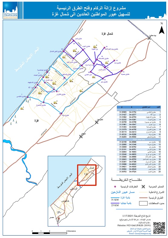 رام الله 17-1-2025 وفا- حدد مجلس الوزراء والهيئة العربية الدولية للإعمار في فلسطين، خريطة الشوارع الرئيسية في قطاع غزة، والتي سيبدأ العمل على فتحها فور وقف العدوان.