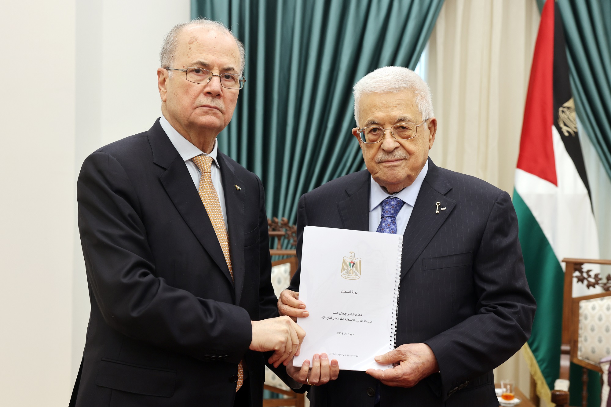 رام الله 19-1-2025 وفا- تسلم رئيس دولة فلسطين محمود عباس، خطة الإغاثة والانعاش المبكر والاستجابة الطارئة لقطاع غزة التي أعدتها الحكومة الفلسطينية لمواجهة الوضع الطارئ في قطاع غزة.