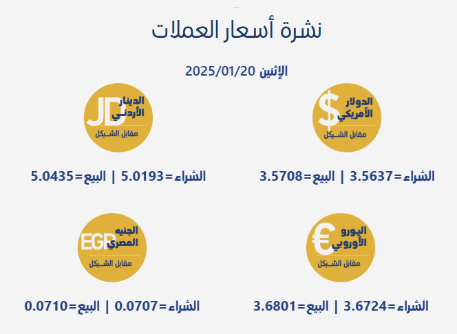 رام الله 20-1-2025 وفا- جاءت أسعار صرف العملات مقابل الشيقل الإسرائيلي، اليوم الإثنين، بحسب سلطة النقد الفلسطينية، على النحو التالي:
