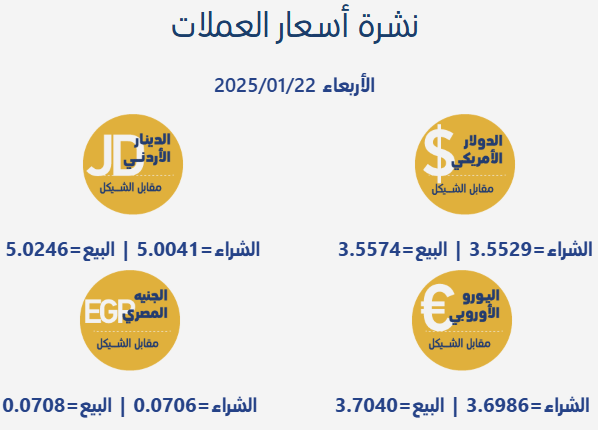 رام الله 22-1-2025 وفا- جاءت أسعار صرف العملات مقابل الشيقل الإسرائيلي، اليوم الأربعاء، بحسب سلطة النقد الفلسطينية، على النحو التالي: