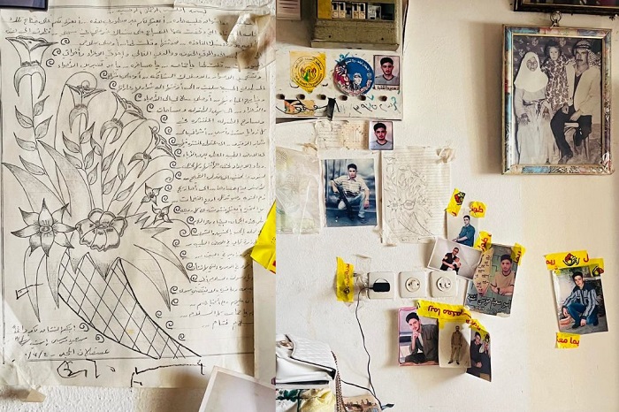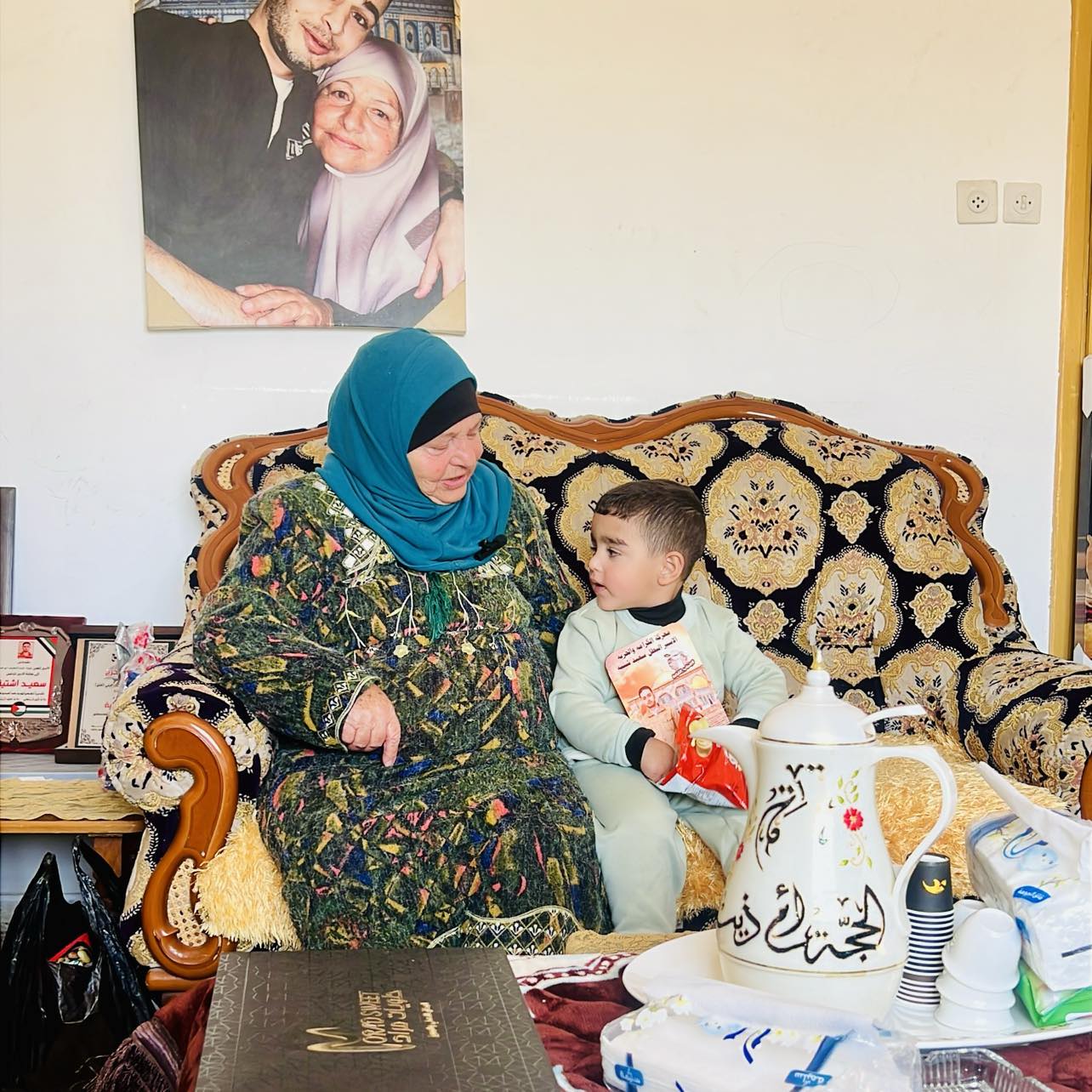 الحاجة ناصيف، تجلس على الأريكة وبجانبها أحد أحفادها الذي لم يتجاوز عمره أربع سنوات، وتحيط بهما صور لسعيد منذ شبابه، وصور تم جمعها بواسطة التقنيات الحديثة وكأنهما يعانقان بعضهما واقعيا. وعلى الطاولة أمامها، وضعت بعض الحلوى، في إشارة رمزية إلى فرحة متوقعة، وإن كانت ممزوجة بالقلق والتوتر.