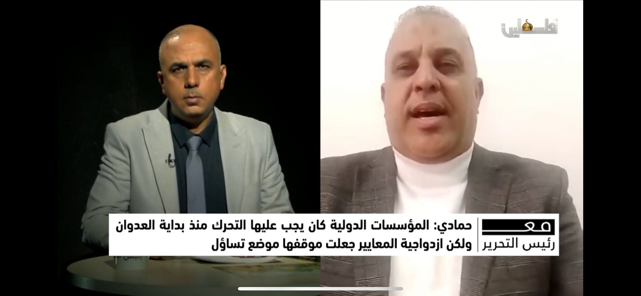 وأشار حمادي إلى الازدواجية في المعايير الدولية، وقال: "العالم لا يحرك ساكنا حيال ما يتعرض له الشعب الفلسطيني، مقارنة مع التحركات المكثفة والسريعة لإنهاء أزمات دولية أخرى"، مؤكدا أن المؤسسات الدولية بحاجة إلى مراجعة تثبت من خلالها دورها في حماية السلم الدولي.