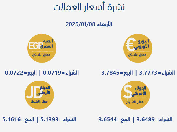 رام الله 8-1-2025 وفا- جاءت أسعار صرف العملات مقابل الشيقل الإسرائيلي، اليوم الأربعاء، بحسب سلطة النقد الفلسطينية، على النحو التالي:
