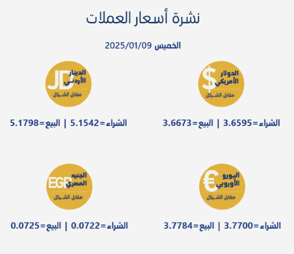 رام الله 9-1-2025 وفا- جاءت أسعار صرف العملات مقابل الشيقل الإسرائيلي، اليوم الخميس، بحسب سلطة النقد الفلسطينية، على النحو التالي:
