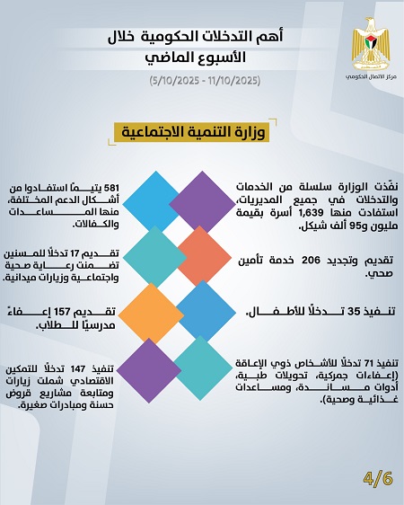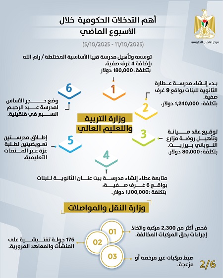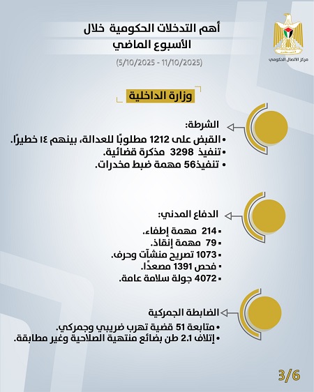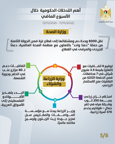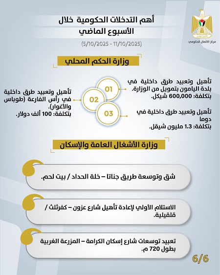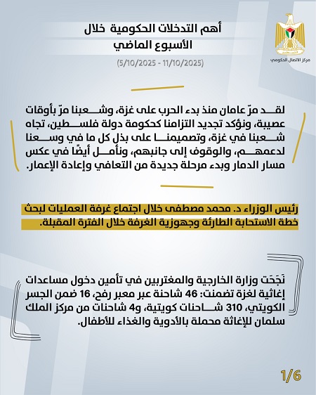 رام الله 12-10-2025 وفا- أصدر مركز الاتصال الحكومي تقريره الأسبوعي الذي يُظهِر أهم التدخلات التنموية والإصلاحية التي نَفَّذَتها الحكومة الفلسطينية، خلال الأسبوع الماضي (05/10/2025– 11/10/2025)، وهي على النحو الآتي: