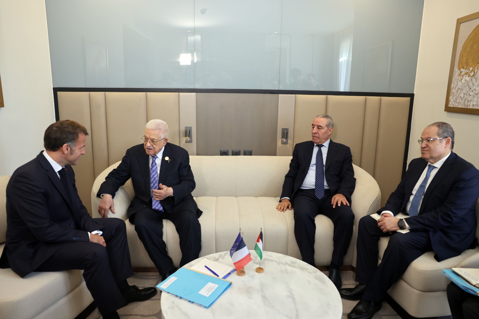 وحضر الاجتماع: نائب الرئيس حسين الشيخ، ومستشار الرئيس للشؤون الدبلوماسية مجدي الخالدي، ووزير خارجية فرنسا جان نويل بارو.