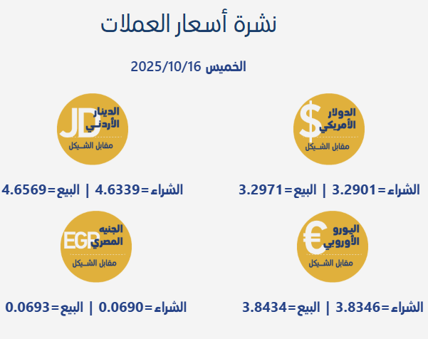 رام الله 16-10-2025 وفا- جاءت أسعار صرف العملات مقابل الشيقل الإسرائيلي، اليوم الخميس، بحسب سلطة النقد الفلسطينية، على النحو التالي:
