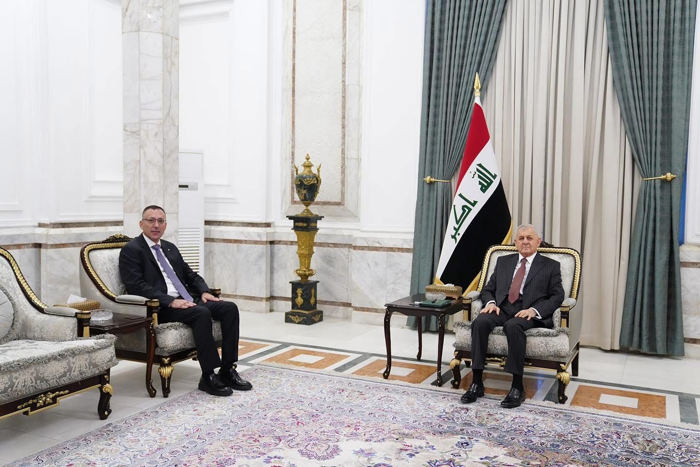 جاء ذلك خلال استقباله سفير دولة فلسطين لدى العراق أحمد الرويضي، اليوم الاثنين، في قصر بغداد، لمناسبة انتهاء مهام عمله.