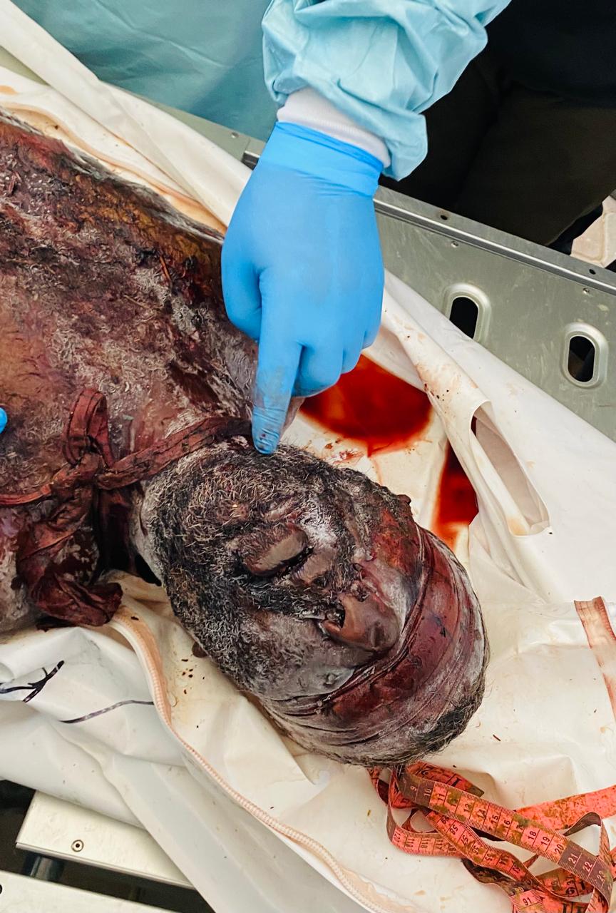 في زاوية الصالة الأمامية جثة لرجل مع بقع صغيرة في جهة من الرأس وفتحة في الناحية الأخرى، قال أحد أفراد الطواقم الطبية إنها غالبا تعرضت لإعدام. جثث أخرى برؤوس مهشمة ومنها مكسرة الأسنان وأخرى بفم محشو بالرمل.