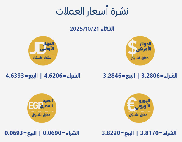 رام الله 21-10-2025 وفا- جاءت أسعار صرف العملات مقابل الشيقل الإسرائيلي، اليوم الثلاثاء، بحسب سلطة النقد الفلسطينية، على النحو التالي: