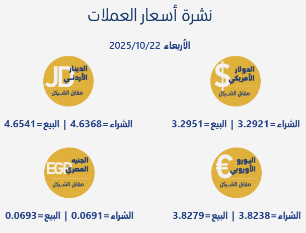 رام الله 22-10-2025 وفا- جاءت أسعار صرف العملات مقابل الشيقل الإسرائيلي، اليوم الأربعاء، بحسب سلطة النقد الفلسطينية، على النحو التالي: