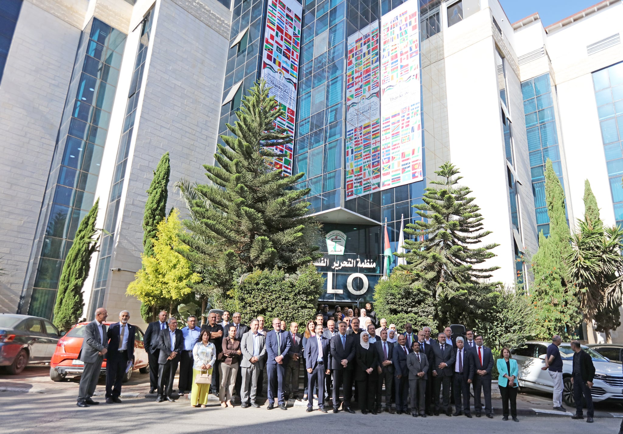 رام الله 22-10-2025 وفا- دشنت منظمة التحرير الفلسطينية، اليوم الأربعاء، جدارية ضخمة على واجهة مقرها في مدينة رام الله، تضم أعلام الدول التي اعترفت بدولة فلسطين.