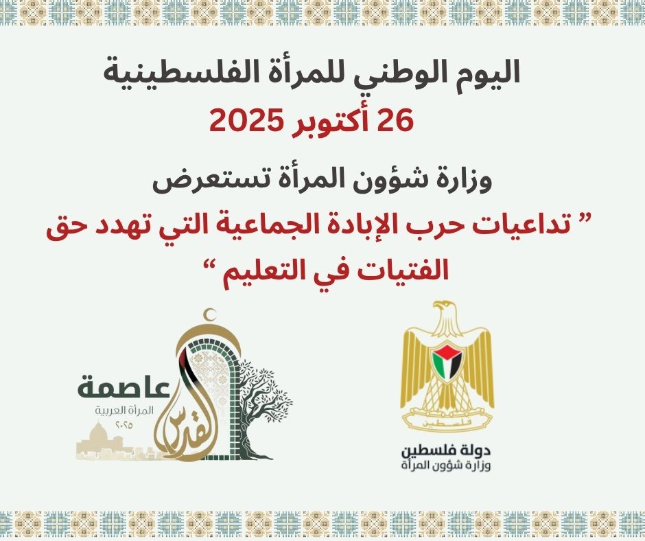 رام الله 23-10-2025 وفا- أطلقت وزارة شؤون المرأة تقريرا تحليليا شاملا بعنوان: "حق التعليم للفتيات في فلسطين: تحديات مستمرة للعام الدراسي 2025-2026"، لمناسبة اليوم الوطني للمرأة الفلسطينية، الذي يصادف 26 تشرين الأول/أكتوبر من كل عام.