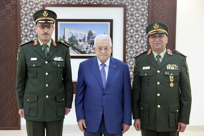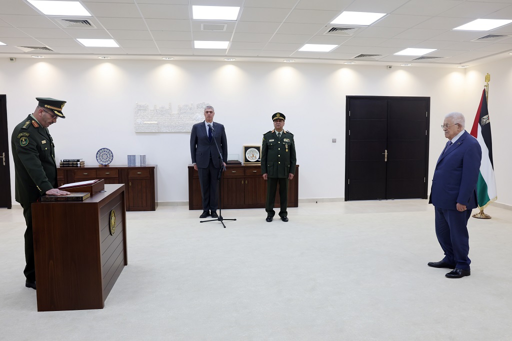 رام الله 27-10-2025 وفا- أدى العميد خالد محمد أحمد سبيتان، اليمين القانونية، أمام رئيس دولة فلسطين محمود عباس، نائباً عاماً عسكرياً.