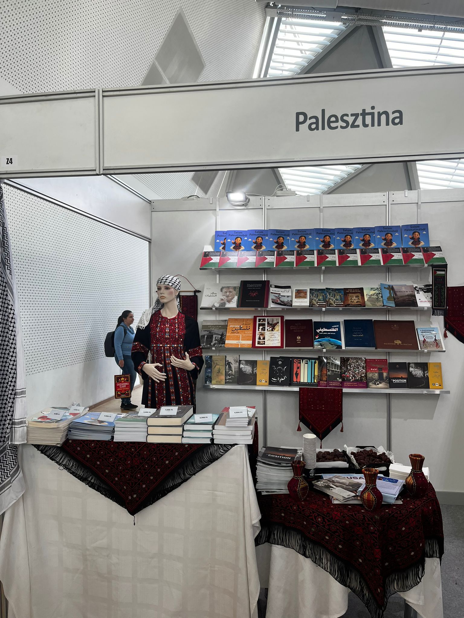 ويعرض الجناح الفلسطيني مجموعة من الكتب والروايات بثلاث لغات: العربية والمجرية والإنجليزية، التي تشمل العديد من المواضيع كالأدب، والتاريخ، والتراث، والسياسة.