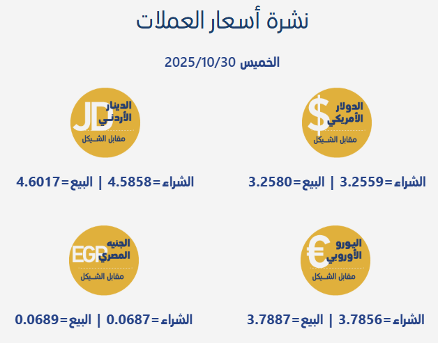رام الله 30-10-2025 وفا- جاءت أسعار صرف العملات مقابل الشيقل الإسرائيلي، اليوم الخميس، بحسب سلطة النقد الفلسطينية، على النحو التالي: