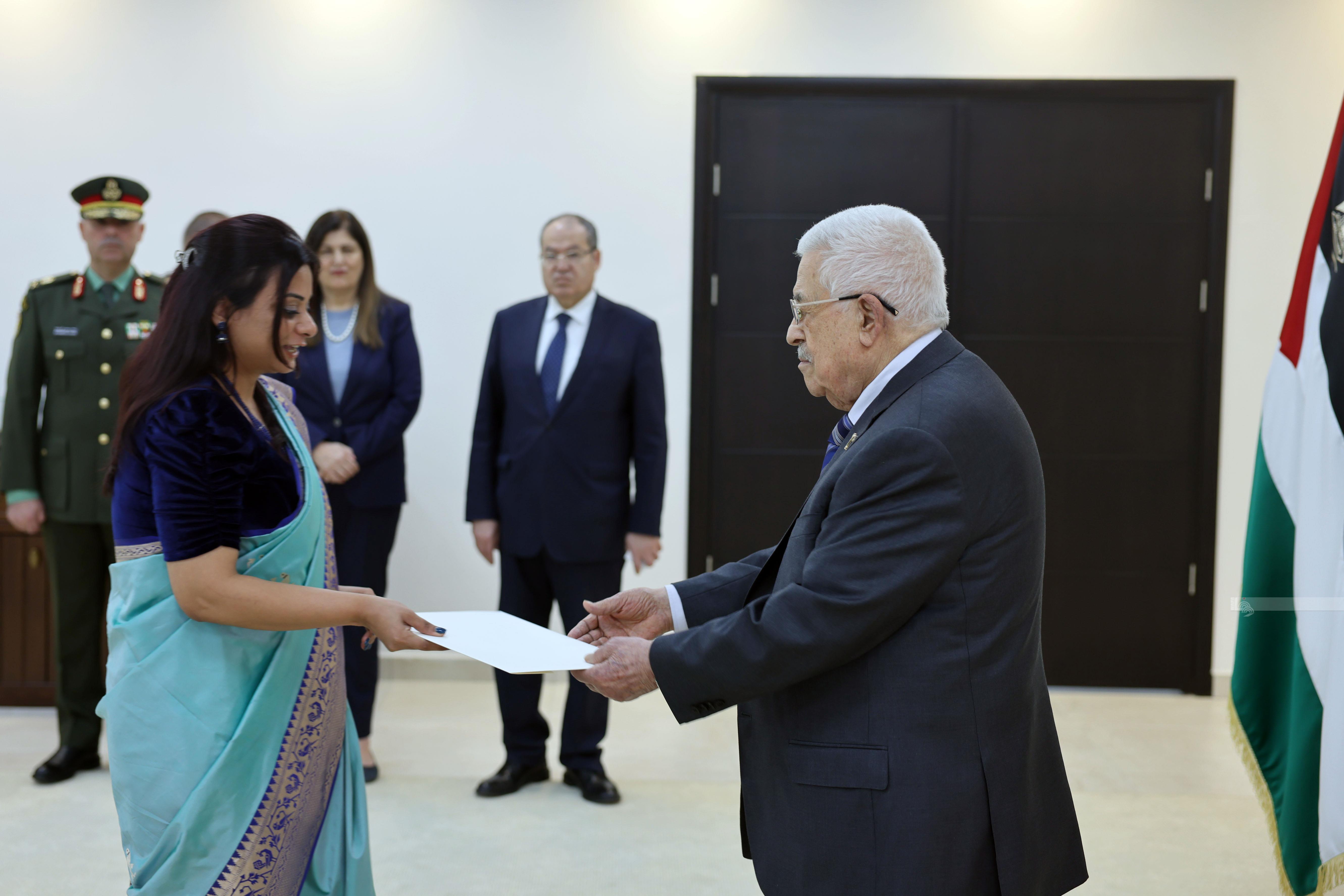 رام الله 6-10-2025 وفا- تقبل رئيس دولة فلسطين محمود عباس، أوراق اعتماد رئيس مكتب تمثيل الهند لدى دولة فلسطين ماهيما سيكاند.