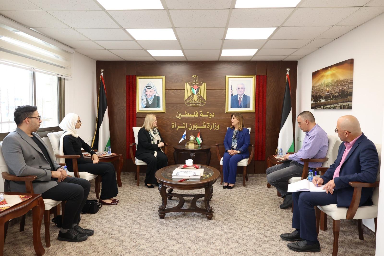 رام الله 9-10-2025 وفا- استقبلت وزيرة شؤون المرأة منى الخليلي، اليوم الخميس في مقر الوزارة، ممثلة جمهورية فنلندا في فلسطين السفيرة تارجا كانجاسكورتي، ووفد مؤسسة الرؤية الفلسطينية، وذلك في إطار المبادرة المشتركة بين الممثلية والمؤسسة بعنوان "سفراء اليوم الواحد" التي تتضمن تجربة مميزة تشارك فيها شابة فلسطينية بدور السفيرة ليوم واحد.