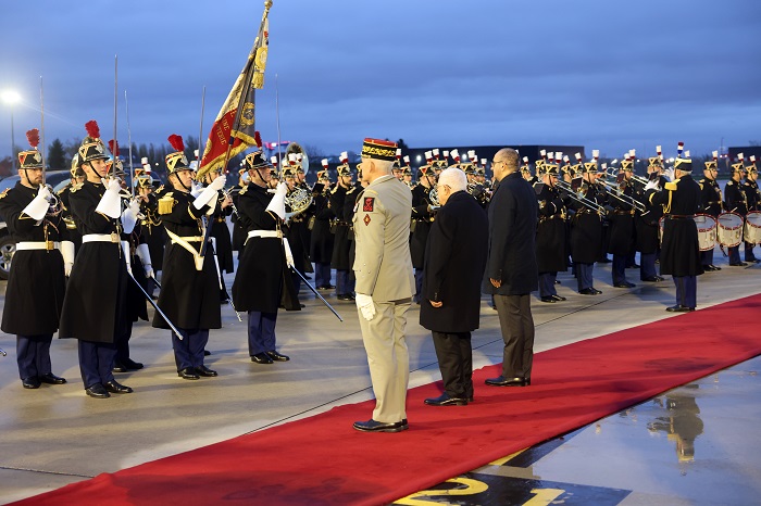 ولدى وصوله، استعرض سيادته حرس الشرف الذي اصطف لتحيته، فيما عزف السلامان الوطنيان الفلسطيني والفرنسي وكان في استقباله وزير الداخلية الفرنسي لوران نونيز.
