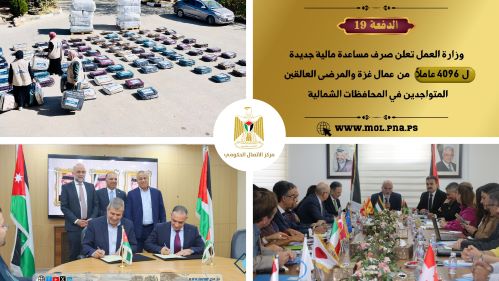 بدورها، أعلنت وزارة العمل عن صرف الدفعة المالية الـ19 بقيمة 700 شيقل لصالح 4096 مستفيدًا من عمال غزة والمرضى ومرافقيهم العالقين في المحافظات الشمالية، فيما نَظَّم الصندوق الفلسطيني للتشغيل اجتماعًا تخطيطيًا للعام القادم لتحديد التخصصات المهنية المطلوبة وفق احتياجات سوق العمل.