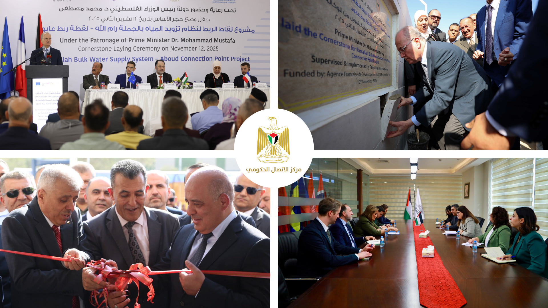 وضع رئيس الوزراء محمد مصطفى حجر الأساس لمشروع نقاط الربط لنظام تزويد المياه بالجملة في عابود، الذي سيستفيد منه خلال مرحلته الأولى حوالي 90 ألف مواطن في 22 تجمعًا، بتكلفة 30 مليون يورو.