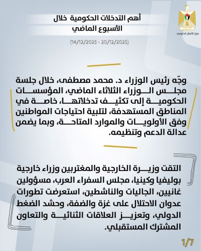 رام الله 21-12-2025 وفا- أصدر مركز الاتصال الحكومي تقريره الأسبوعي، الذي يُظهِر أهم التدخلات التنموية والإصلاحية التي نَفَّذَتها الحكومة، خلال فترة الأسبوع الماضي (14/12/2025 – 20/12/2025)، على النحو الآتي: