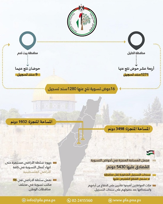وأكدت عياد أن سلطة الأراضي تواصل تنفيذ الخطة الوطنية للتسوية بكوادرها الفنية والقانونية، وبالتنسيق مع الجهات ذات العلاقة.