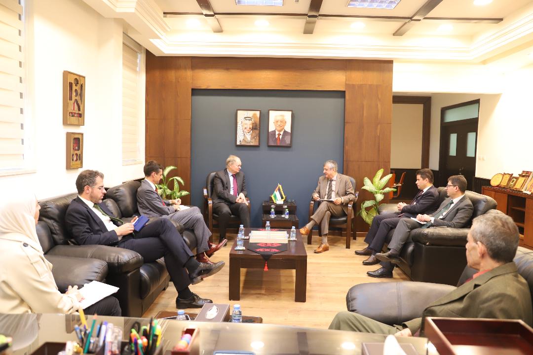 رام الله 7-12-2025 وفا- بحث وزير الأشغال العامة والإسكان، عاهد فائق بسيسو، مع ممثلي الاتحاد الأوروبي: رئيس وحدة إدارة الأزمات في الاتحاد كريستيان برجر، ومبعوث الاتحاد لدى فلسطين ألكسندر ستوتزمان،  سبل تعزيز التعاون الثنائي ومناقشة آفاق الشراكة المستقبلية في مجالات إعادة إعمار قطاع غزة ومشاريع البنية التحتية والإسكان.