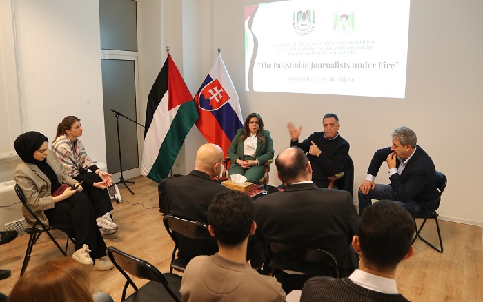 براتيسلافا 9-12-2025 وفا- نظّمت سفارة دولة فلسطين في جمهورية سلوفاكيا، بالتعاون مع وكالة الأنباء والمعلومات الفلسطينية "وفا" ونقابة الصحفيين الفلسطينيين، فعالية مركزية بمناسبة يوم التضامن العالمي مع الشعب الفلسطيني، شملت ندوة خاصة ومعرض صور يجسّد نضال الشعب الفلسطيني ومعاناته اليومية تحت الاحتلال.