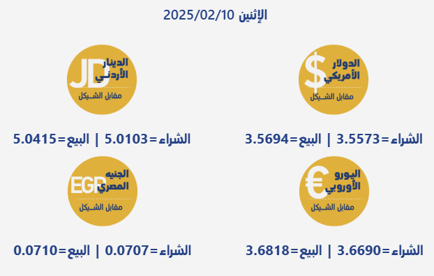 رام الله 10-2-2025 وفا- جاءت أسعار صرف العملات مقابل الشيقل الإسرائيلي، اليوم الإثنين، بحسب سلطة النقد الفلسطينية، على النحو التالي: