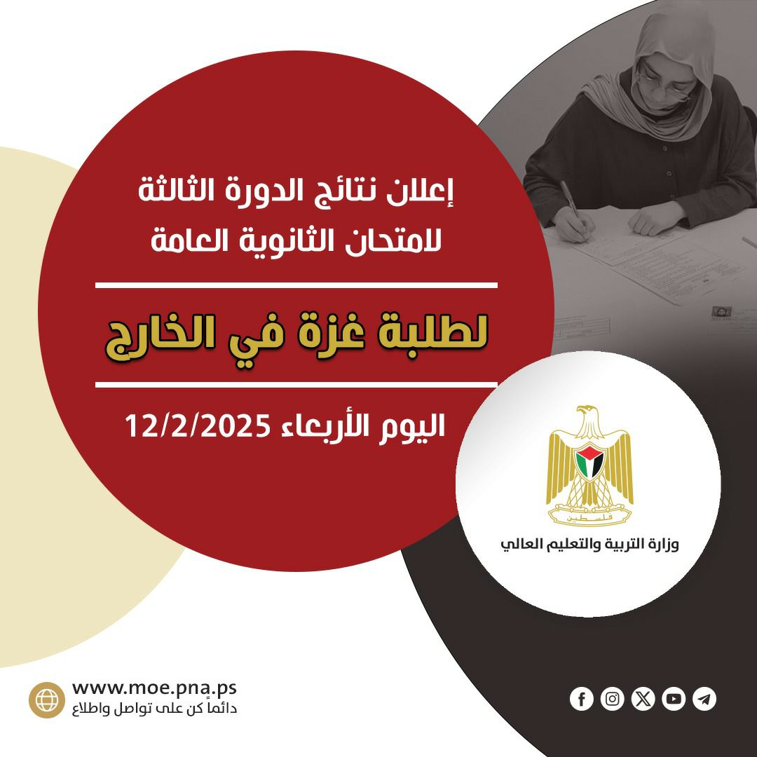 رام الله 12-2-2025 وفا- أعلنت وزارة التربية والتعليم العالي، اليوم الأربعاء، نتائج الدورة الثالثة لامتحان الثانوية العامة لطلبة قطاع غزة ممن هم خارج القطاع.