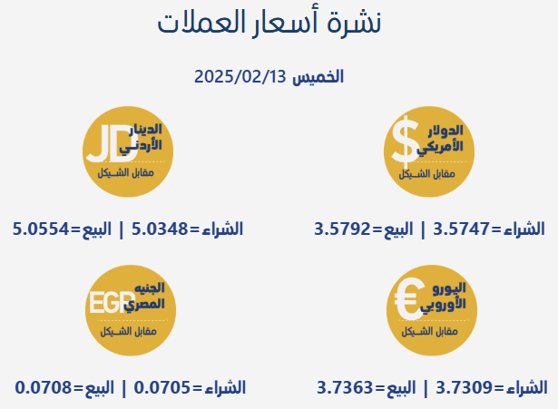 رام الله 13-2-2025 وفا- جاءت أسعار صرف العملات مقابل الشيقل الإسرائيلي، اليوم الخميس، بحسب سلطة النقد الفلسطينية، على النحو التالي: