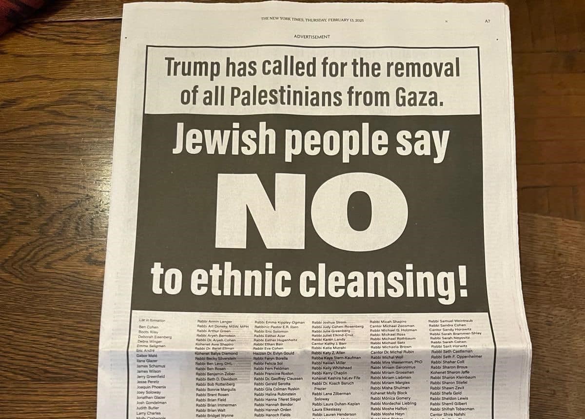 ونُشر الإعلان، اليوم الخميس، في صحيفة "نيويورك تايمز"، تحت عنوان: "ترمب دعا إلى إبعاد جميع الفلسطينيين من غزة. الشعب اليهودي يقول لا للتطهير العرقي".