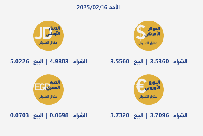 رام الله 16-2-2025 وفا- جاءت أسعار صرف العملات مقابل الشيقل الإسرائيلي، اليوم الأحد، بحسب سلطة النقد الفلسطينية، على النحو التالي: