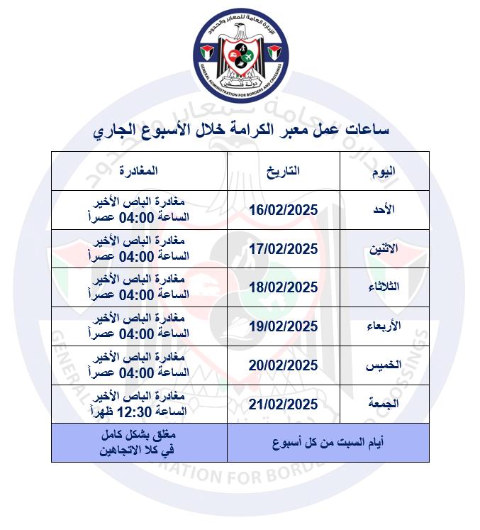 أريحا 16-2-2025 وفا- أعلنت الإدارة العامة للمعابر والحدود، اليوم الأحد، ساعات عمل معبر الكرامة (جسر الملك حسين) خلال الأسبوع الجاري.