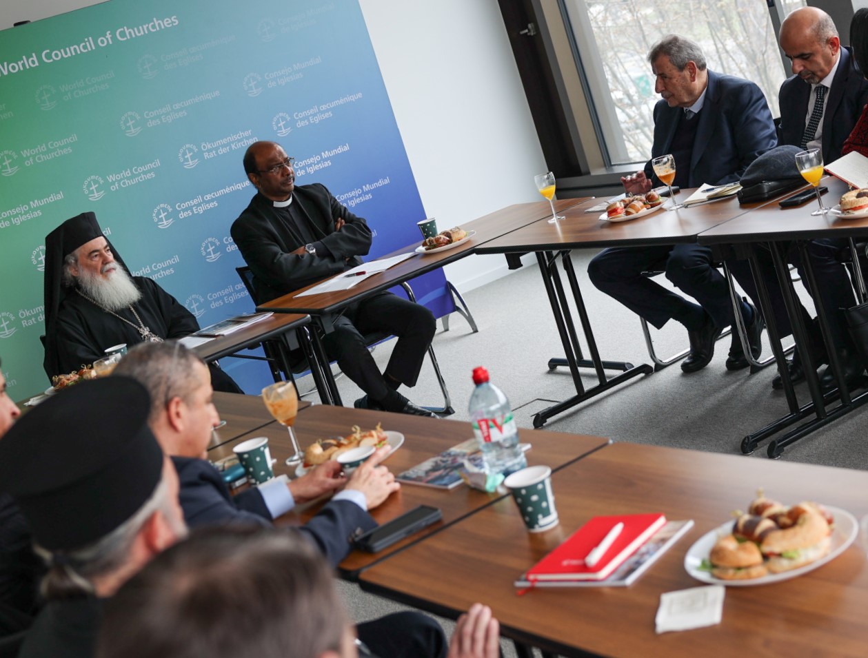 ونقل خوري تحيات الرئيس محمود عباس، مشيدا بالمواقف الثابتة لمجلس الكنائس العالمي في دعم الشعب الفلسطيني، ورفضه القاطع للمخططات الهادفة إلى تهجير الفلسطينيين، خاصة من قطاع غزة، التي تتبناها أطراف دولية. كما حذر من خطورة الأوضاع المتدهورة في فلسطين جراء السياسات الإسرائيلية القمعية، والتضييق المستمر على الفلسطينيين في مدن الضفة الغربية، بما فيها القدس، بالإضافة إلى حرب الإبادة التي تشنها إسرائيل على قطاع غزة، وما لها من تأثير مباشر يهدد الوجود المسيحي في الأرض المقدسة.