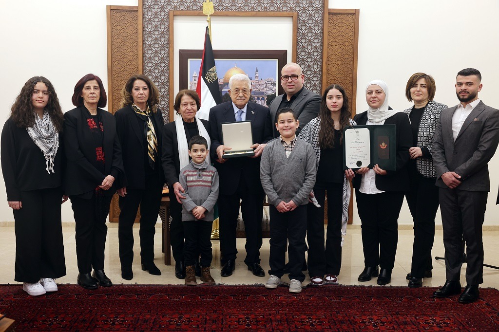 رام الله 21-2-2025 وفا- منح رئيس دولة فلسطين محمود عباس، المناضل الوطني الكبير المرحوم عبد الإله الأتيرة، نجمة يبوس من وسام الرئيس ياسر عرفات.