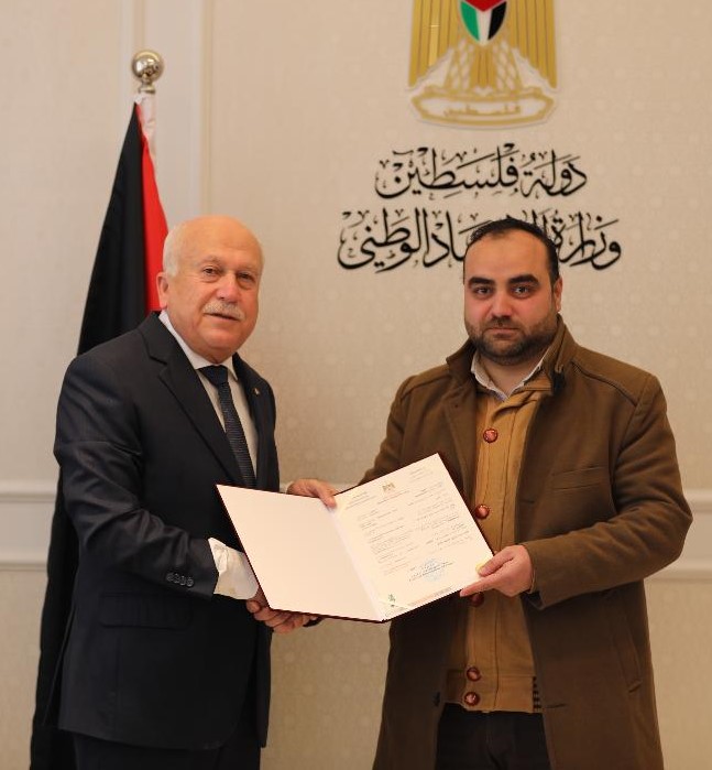 رام الله 25-2-2025 وفا- سلم وزير الاقتصاد الوطني محمد العامور، المخترع الفلسطيني خالد عبد اللطيف شهادة براءة اختراع لابتكاره الجديد الذي يسهم في تعزيز السلامة في الأنظمة الكهربائية.