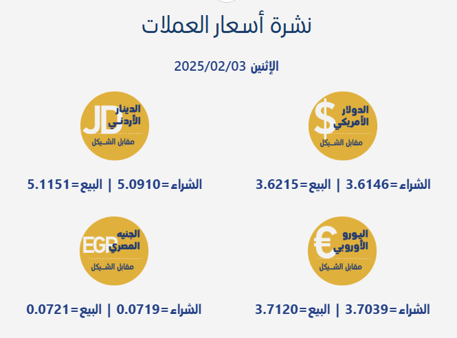 رام الله 3-2-2025 وفا- جاءت أسعار صرف العملات مقابل الشيقل الإسرائيلي، اليوم الإثنين، بحسب سلطة النقد الفلسطينية، على النحو التالي: