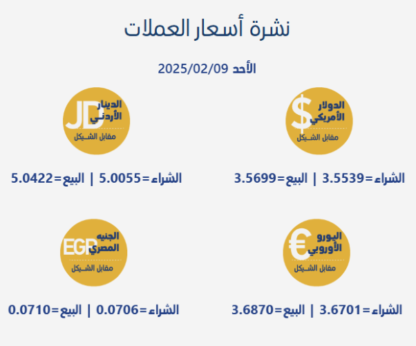 رام الله 9-2-2025 وفا- جاءت أسعار صرف العملات مقابل الشيقل الإسرائيلي، اليوم الأحد، بحسب سلطة النقد الفلسطينية، على النحو التالي: