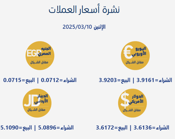 رام الله 10-3-2025 وفا- جاءت أسعار صرف العملات مقابل الشيقل الإسرائيلي، اليوم الاثنين، بحسب سلطة النقد الفلسطينية، على النحو التالي: