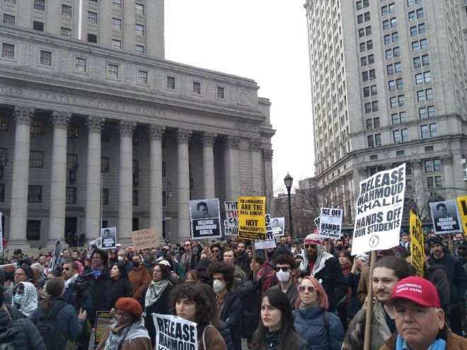 كما تظاهر المئات من النشطاء أمام محكمة مانهاتن الفيدرالية بنيويورك للمطالبة بالإفراج الفوري عن خليل، في الوقت الذي كانت تعقد فيه محكمة الاستماع الأولى في قضية الناشط الفلسطيني، إذ مدد القاضي جيسي فورمان عقب جلسة الاستماع قرار منع ترحيل خليل بشكل مؤقت الذي اتخذه الاثنين الماضي بسبب نشاطه المؤيد للفلسطينيين في الحرم الجامعي، لمنح القاضي نفسه المزيد من الوقت فيما إذا كان الاعتقال تم بشكل دستوري.