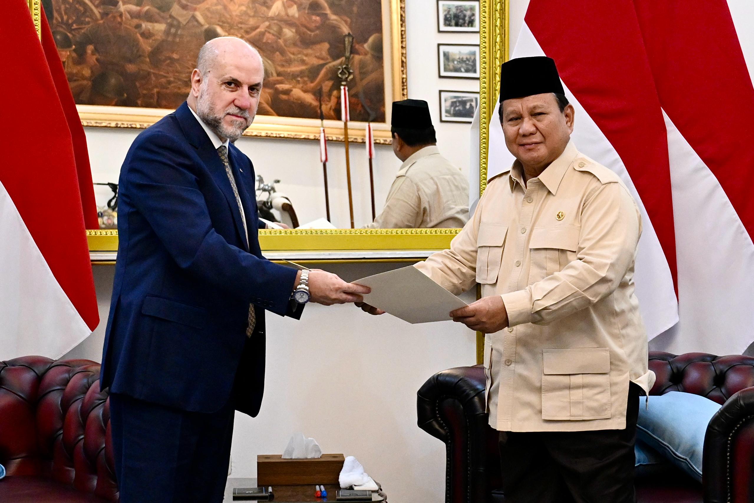 جاكرتا 18-3-2025 وفا- سلم قاضي قضاة فلسطين، مستشار الرئيس للشؤون الدينية والعلاقات الإسلامية محمود الهباش، رسالة خطية من الرئيس محمود عباس رئيس دولة فلسطين إلى رئيس جمهورية إندونيسيا فرابوو سوبيانتو تتعلق بالوضع في فلسطين والعلاقات الثنائية بين البلدين.