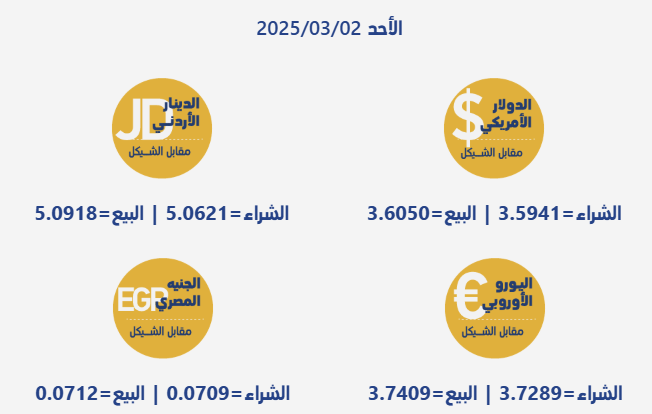 رام الله 2-3-2025 وفا- جاءت أسعار صرف العملات مقابل الشيقل الإسرائيلي، اليوم الأحد، بحسب سلطة النقد الفلسطينية، على النحو التالي: