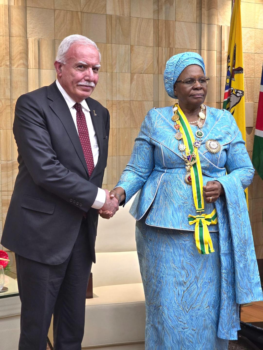ويندهوك 21-3-2025 وفا- شارك مستشار الرئيس للعلاقات الدولية ومبعوثه الخاص رياض المالكي في حفل تنصيب رئيسة جمهورية ناميبيا نتومبو ناندي-نداتو، بصفتها أول رئيسة منتخبة في تاريخ البلاد، وثاني امرأة تتولى منصب الرئاسة على مستوى القارة الإفريقية.