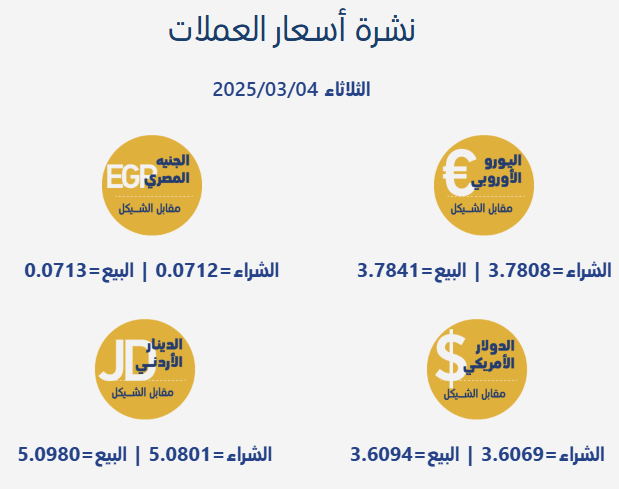 رام الله 4-3-2025 وفا- جاءت أسعار صرف العملات مقابل الشيقل الإسرائيلي، اليوم الثلاثاء، بحسب سلطة النقد الفلسطينية، على النحو التالي: