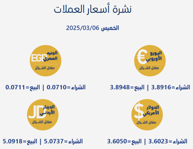 رام الله 6-3-2025 وفا- جاءت أسعار صرف العملات مقابل الشيقل الإسرائيلي، اليوم الخميس، بحسب سلطة النقد الفلسطينية، على النحو التالي: