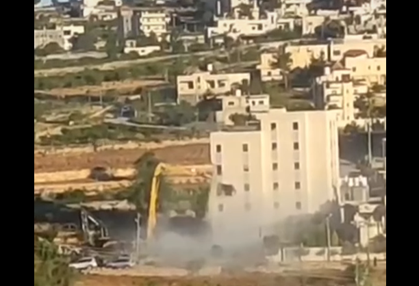 الخليل 21-4-2025 وفا- شرعت جرافات الاحتلال الإسرائيلي، منذ صباح اليوم الاثنين، بهدم عمارة سكنية، مكونة من سبعة طوابق قيد الانشاء، في بلدة بيت أمر، شمال الخليل.
