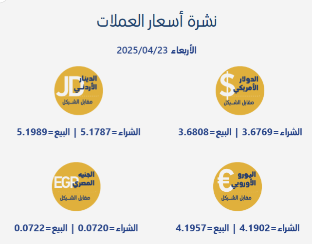 رام الله 23-4-2025 وفا- جاءت أسعار صرف العملات مقابل الشيقل الإسرائيلي، اليوم الأربعاء، بحسب سلطة النقد الفلسطينية، على النحو التالي: